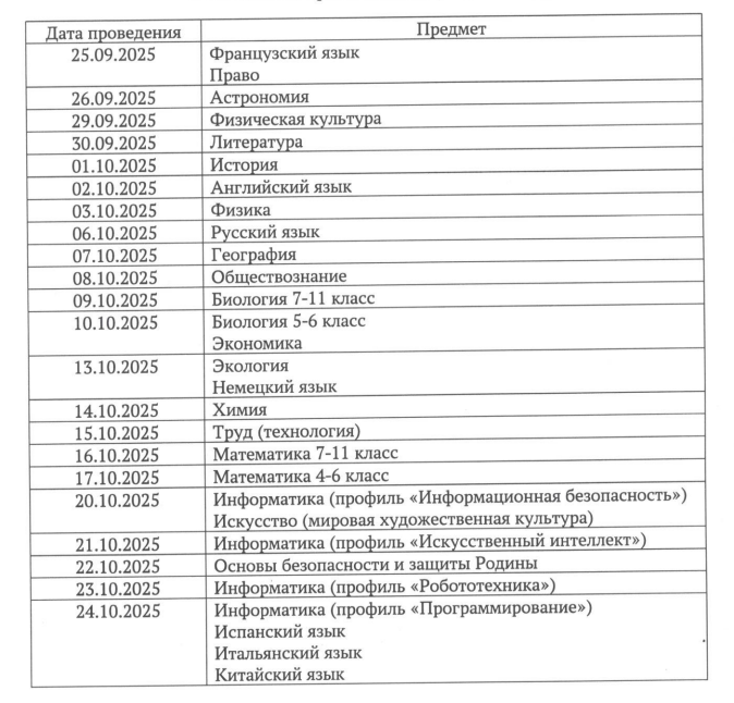 С 25.09.2025 в нашей школе стартует школьный этап Всероссийской олимпиады школьников по общеобразовательным предметам. Все желающие с 4-11 класс могут приять участие в олимпиаде и проверить диапазон своих знаний по предметам школьной программы.